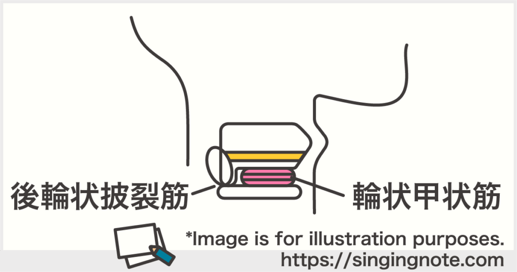 輪状甲状筋と後輪状披裂筋を緊張させることで、声帯が伸ばされ、歌声が高くなります。